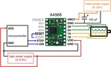 Создатели робототехники могут купить драйвер А4988 шагового двигателя по доступной цене для управления биполярными шаговыми двигателями. Допустимый выходной ток на обмотку с дополнительным охлаждением – до 2 А, без охлаждения – до 1 А. В числе преимуществ драйвера А4988 – наличие защиты от перегрузок и перегрева, возможность регулировки тока и несколько вариантов микрошага. Управление драйвером шагового двигателя отличается простотой интерфейса. Контроль тока обеспечивает возможность установки максимального выходного тока и, как следствие, высокую угловую скорость шага двигателя. Данный драйвер шагового двигателя способен управлять однополярными шаговыми двигателями с 6 или 8 выводами. Для работы необходимо питание логического уровня, для пиковых значений по силе тока требуются конденсаторы. Драйвер управляет промежуточными шагами двигателя, размер шага задается переключателями на входах. Правильная работа в микрошаговом режиме достигается только при использовании слабого тока. Драйвер А4988 не подходит для управления униполярным двигателем с 5 выводами.