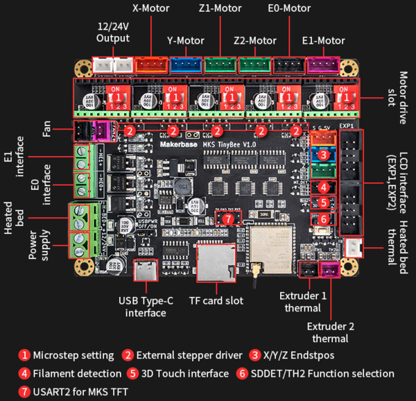 MKS TinyBee — это материнская плата для 3D-печати, основанная на модуле ESP32. Поддержка прошивки Marlin2.0, в дополнение к обычным экранам LCD2004, 12864, она также поддерживает серийный экран MKS MINI12864 V3, MKS TFT и MKS H43. Прошивку можно обновить через USB. Может быть подключен к WIFI, печать веб-страницы.