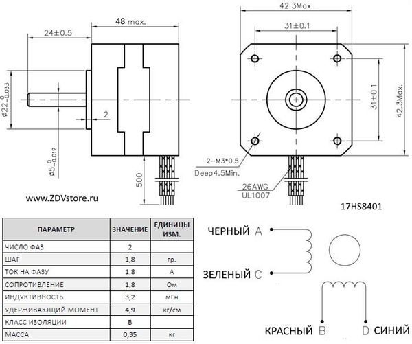 Шаговый двигатель 17HS8401 биполярный (2 обмотки, 4 вывода), с посадочным местом NEMA17 и размером фланца 42 мм. Это один из серии моторов 17HSxxxx с высоким крутящим моментом, который хорошо зарекомендовал себя в 3D принтерах RepRap Prusa Mendel и небольших станках с ЧПУ.